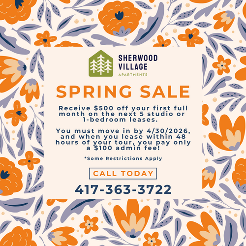 Start your next chapter at Sherwood Village Apartments and discover relaxing living in an ideal location. Select from newly upgraded studio, 1, 2, or 3-bedroom apartments featuring an open floor plan, washer and dryer connection, fully equipped kitchen, high-speed internet, and extra storage. Our community amenities include a sunlit swimming pool, a high-energy fitness center, an indoor basketball court, and package lockers. You'll love our Springfield, MO location, just minutes away from shopping, dining, and entertainment. Live your best life at Sherwood Village. We offer smoke-free living.